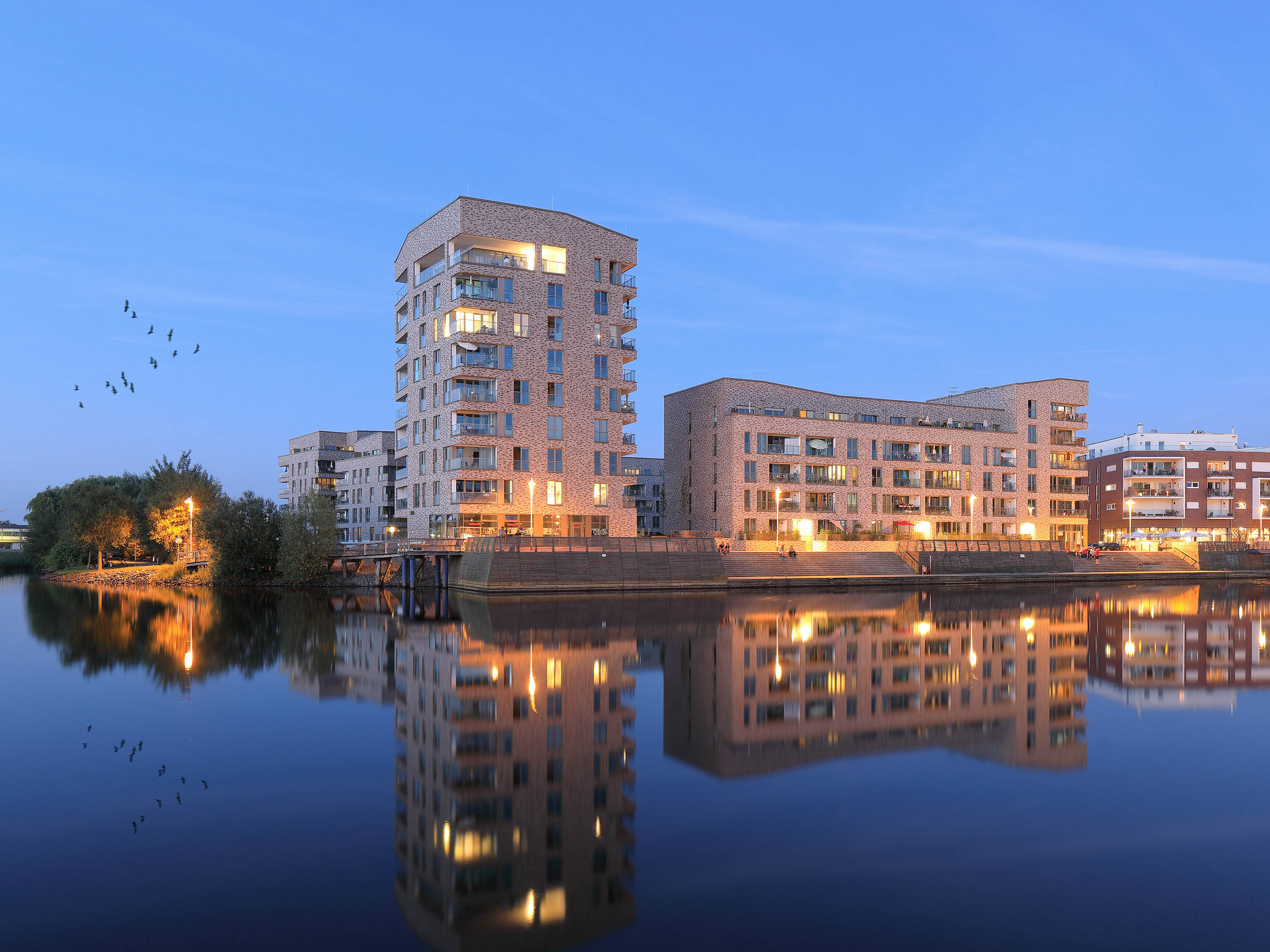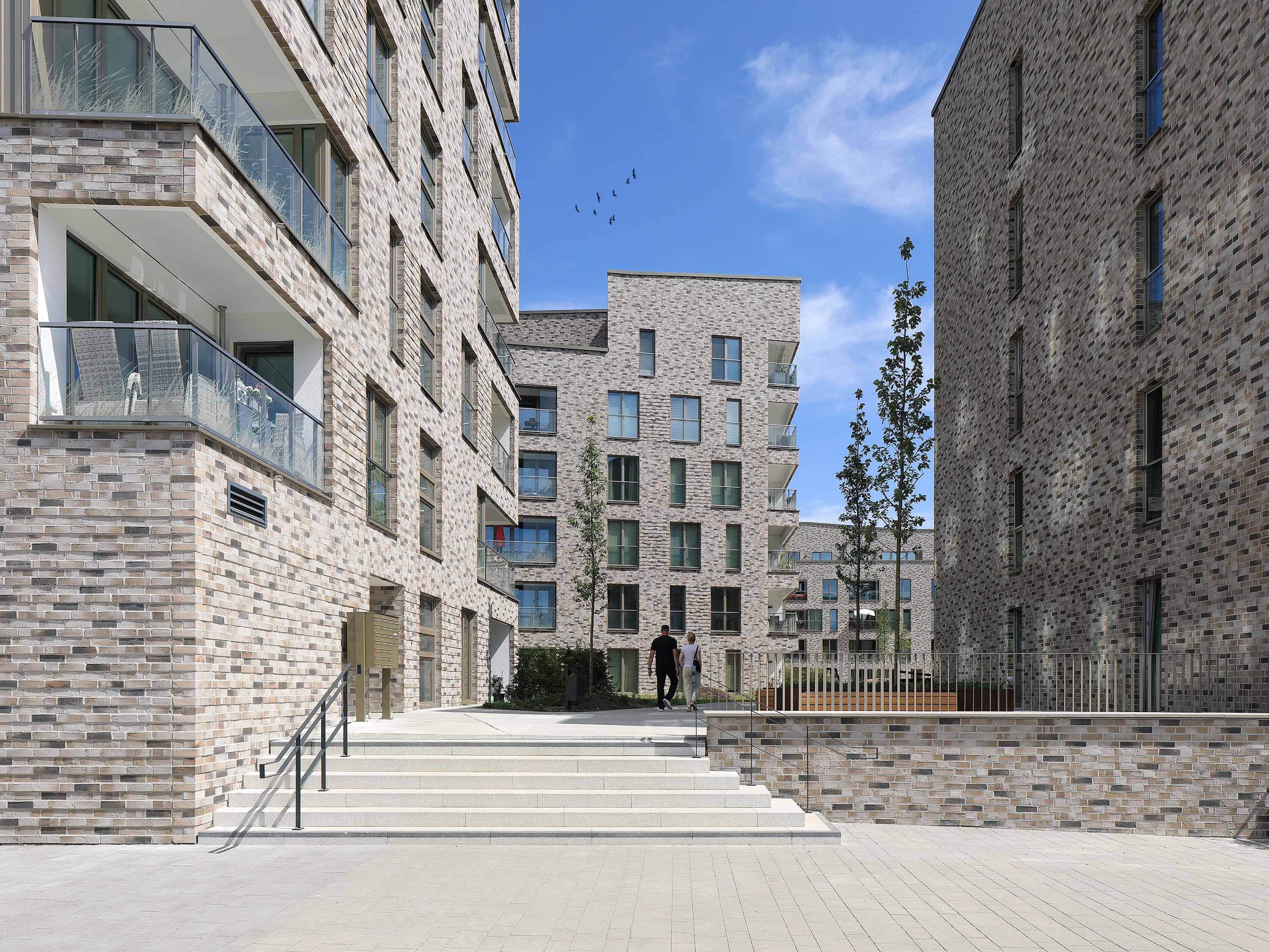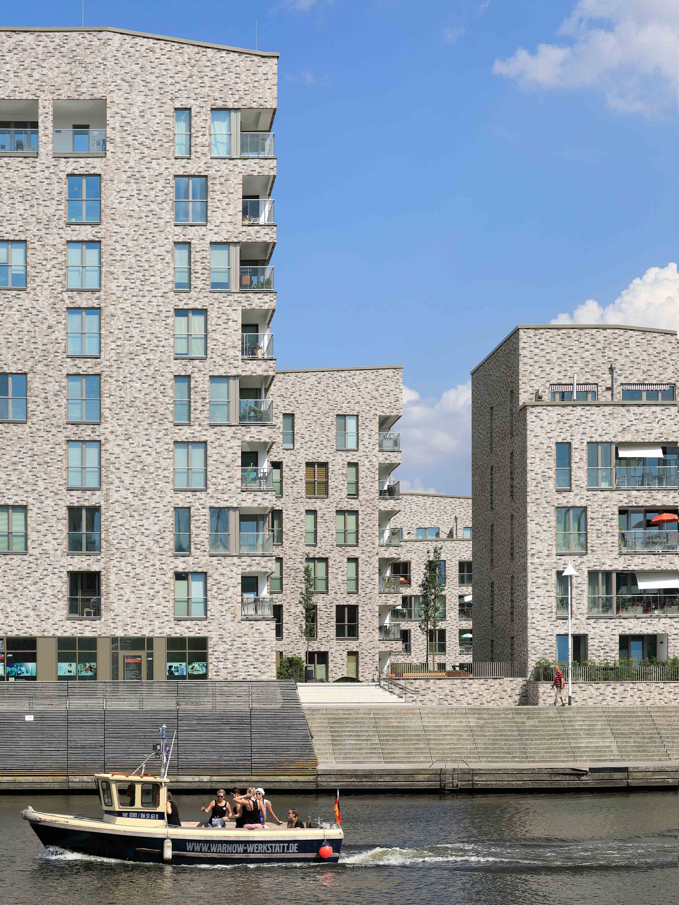 Ein langgezogener U-förmiger fünf- bis sechsgeschossiger Wohnblock bildet den Rücken des Ensembles. Das Haus öffnet sich zur Warnow und gleichzeitig zu den weiteren vier Solitären mit unterschiedlicher Höhe von fünf bis neun Geschossen. Dabei übernimmt das Gebäude mit der höchsten Geschossanzahl, das direkt am Wasser platziert ist, die Rolle eines Leuchtturms in der Stadtlandschaft. Für eine einheitliche wie lebendige Wahrnehmung sorgen die Fassaden im traditionellen Gewand aus hellgrauem und beigem Klinker.