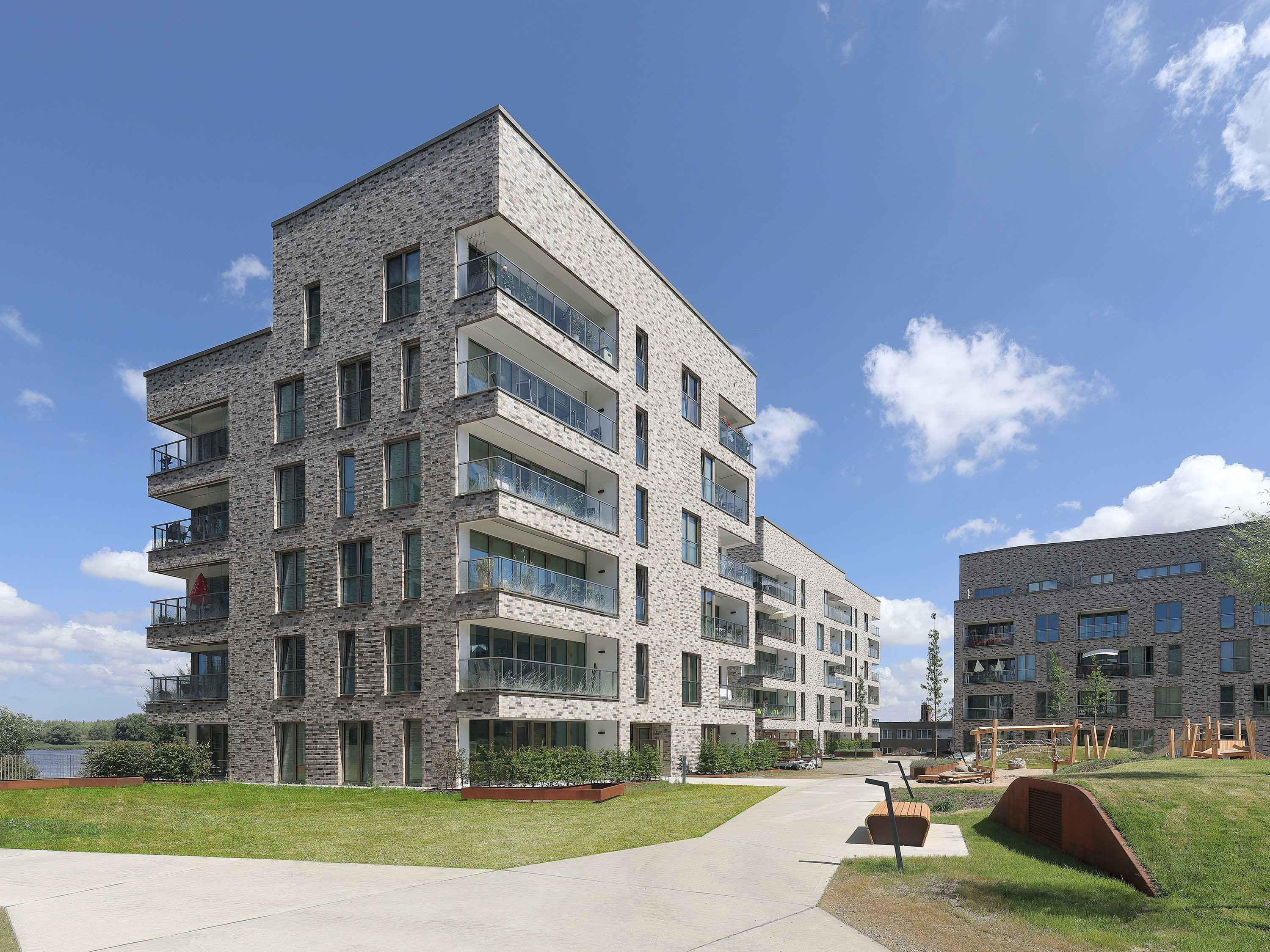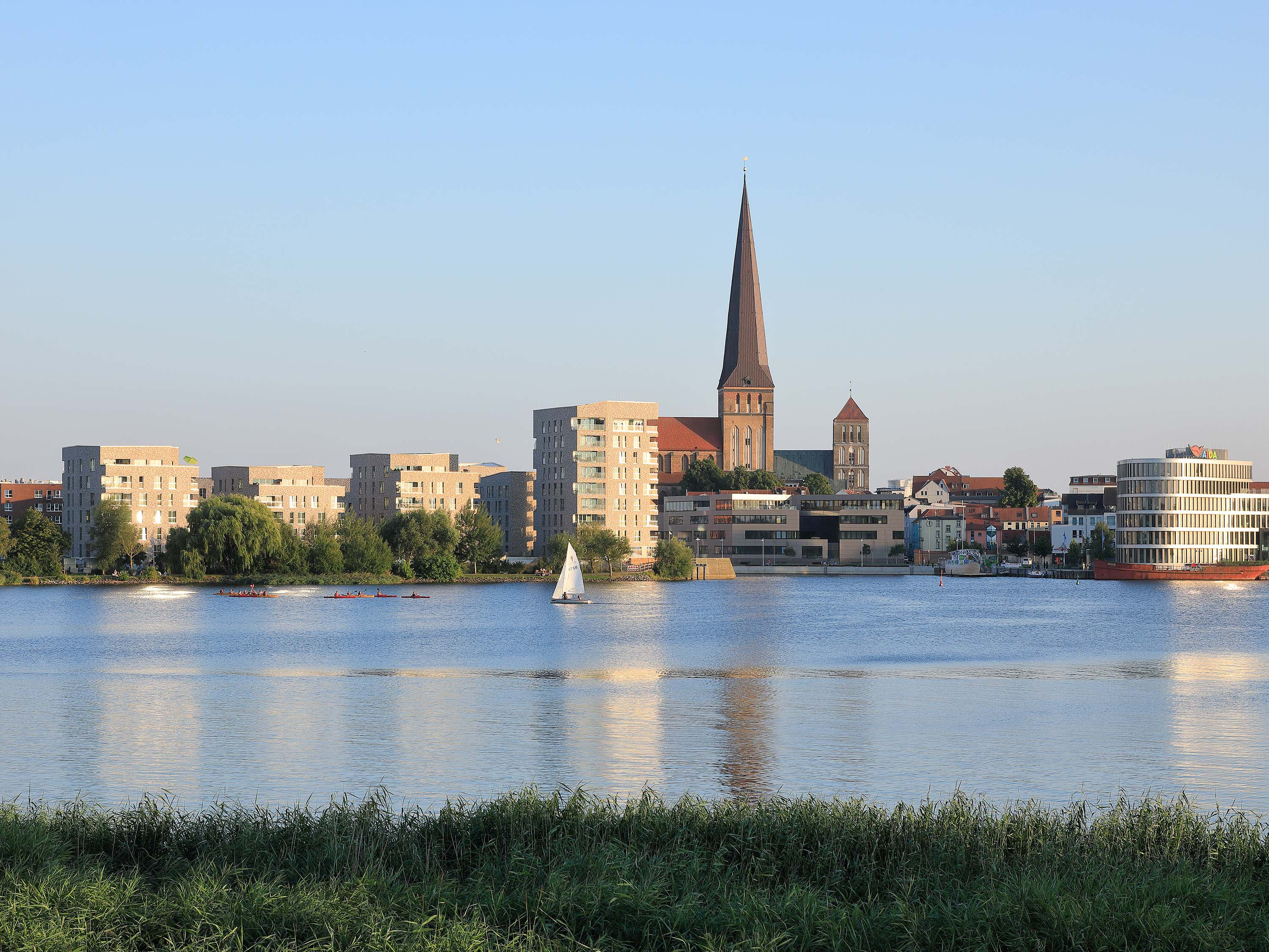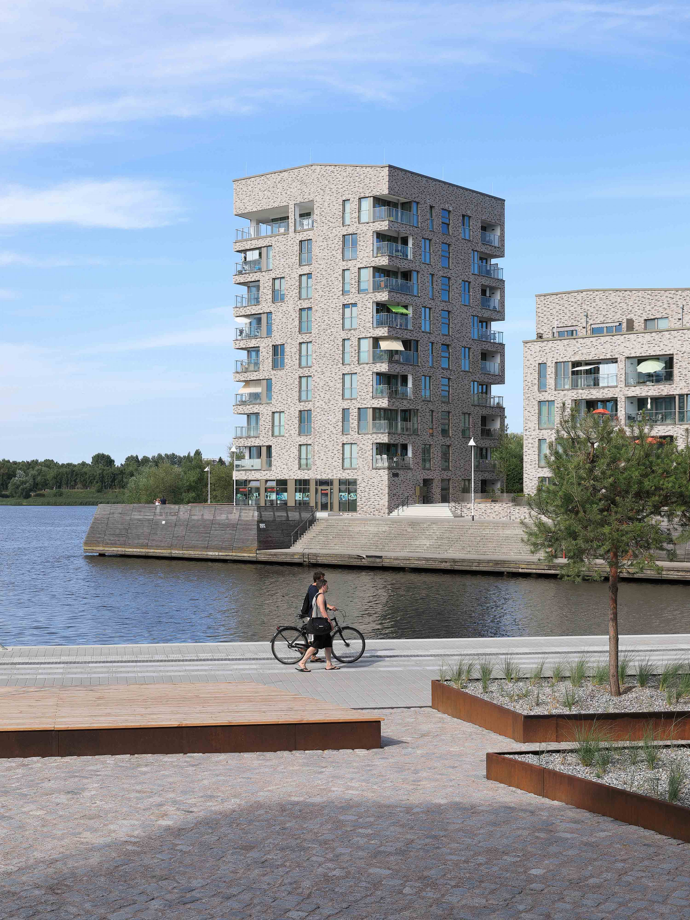 Ein langgezogener U-förmiger fünf- bis sechsgeschossiger Wohnblock bildet den Rücken des Ensembles. Das Haus öffnet sich zur Warnow und gleichzeitig zu den weiteren vier Solitären mit unterschiedlicher Höhe von fünf bis neun Geschossen. Dabei übernimmt das Gebäude mit der höchsten Geschossanzahl, das direkt am Wasser platziert ist, die Rolle eines Leuchtturms in der Stadtlandschaft. Für eine einheitliche wie lebendige Wahrnehmung sorgen die Fassaden im traditionellen Gewand aus hellgrauem und beigem Klinker.