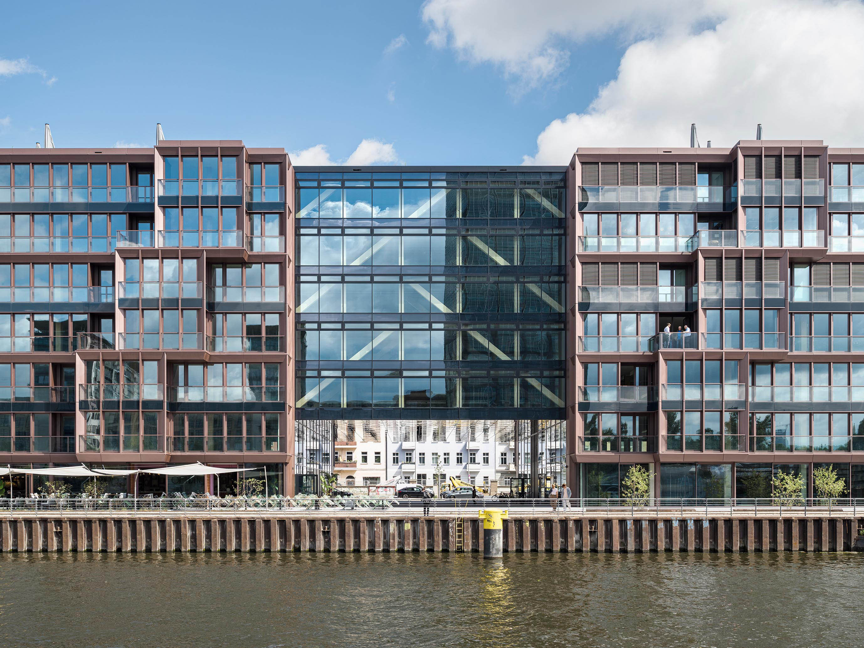 Dockyard, a modern seven-storey office building complex with an underground car park, was built in Berlin's Osthafen using a sustainable, climate and resource-friendly timber hybrid construction method.