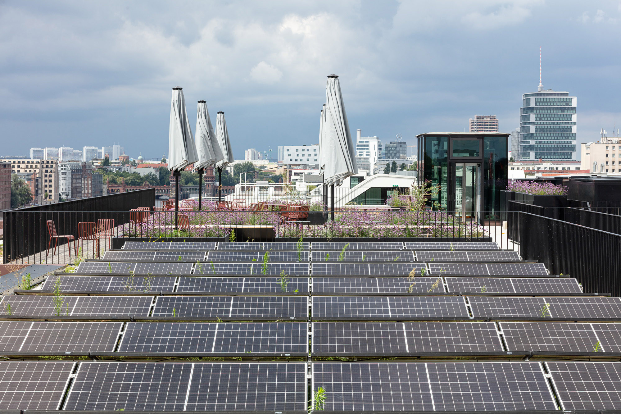 The roofs have been extensively planted with greenery. On both parts of the building roof terraces with seating offer panoramic views of the Spree in the direction of the Wrangelkiez (Wrangel neighbourhood) in Kreuzberg.