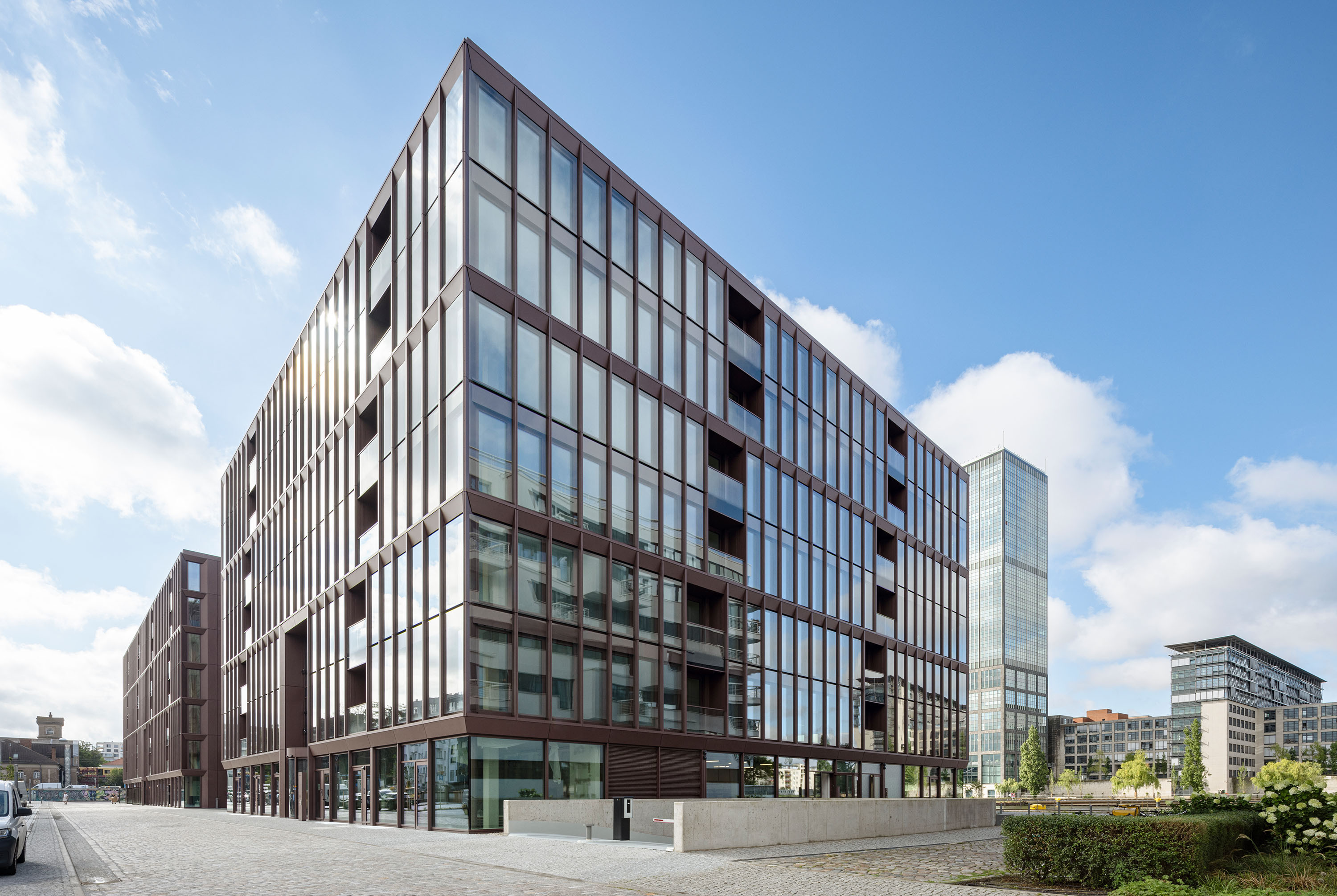 The main façades from the first to the sixth floors are glass unitized façades with a two-storey grid of cornices and pilaster strips. The south façades overlooking the Spree are articulated by projecting bay windows that are offset every two floors and support balconies. The glass façades on the west, north, and east sides have partly recessed loggias, which are likewise offset every two floors.