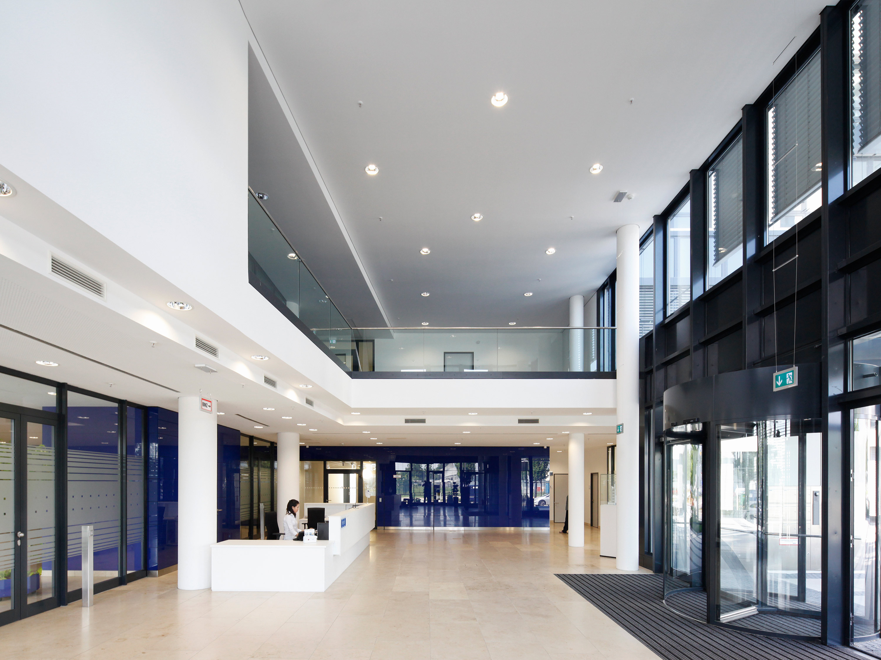 The basic shape of the building corresponds to an elongated block, from which two small courtyards enclosed on three sides are cut out alternately, creating an S-shaped floor plan. One courtyard faces the De-Saint-Exupery-Strasse and forms the main entrance to the building.