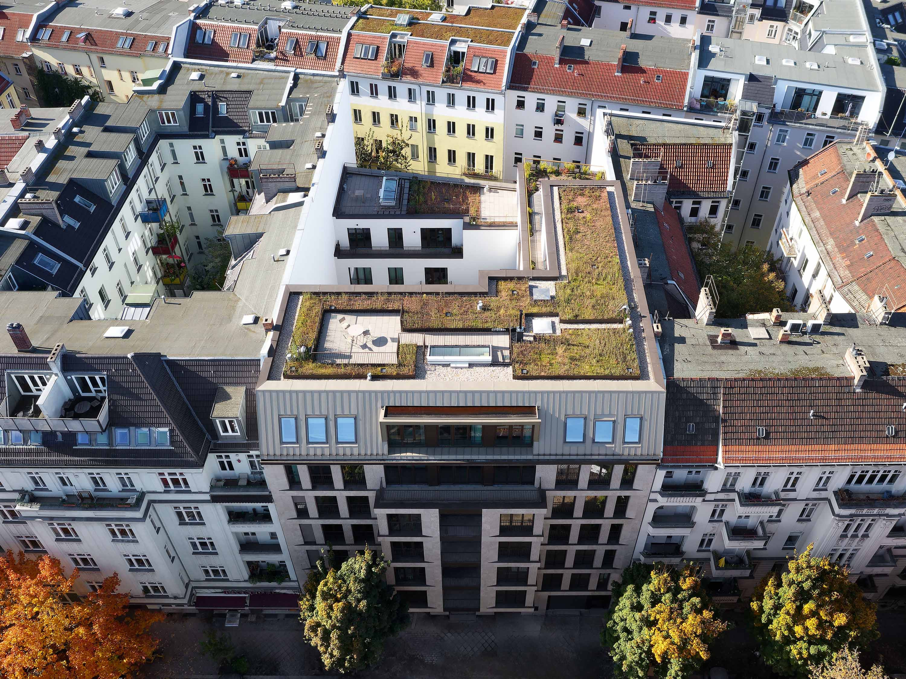 The U-shaped ensemble is conceptually based on the typical Berlin residential courtyard, consisting of a front building, side wings and a garden house, which enclose a green inner courtyard.