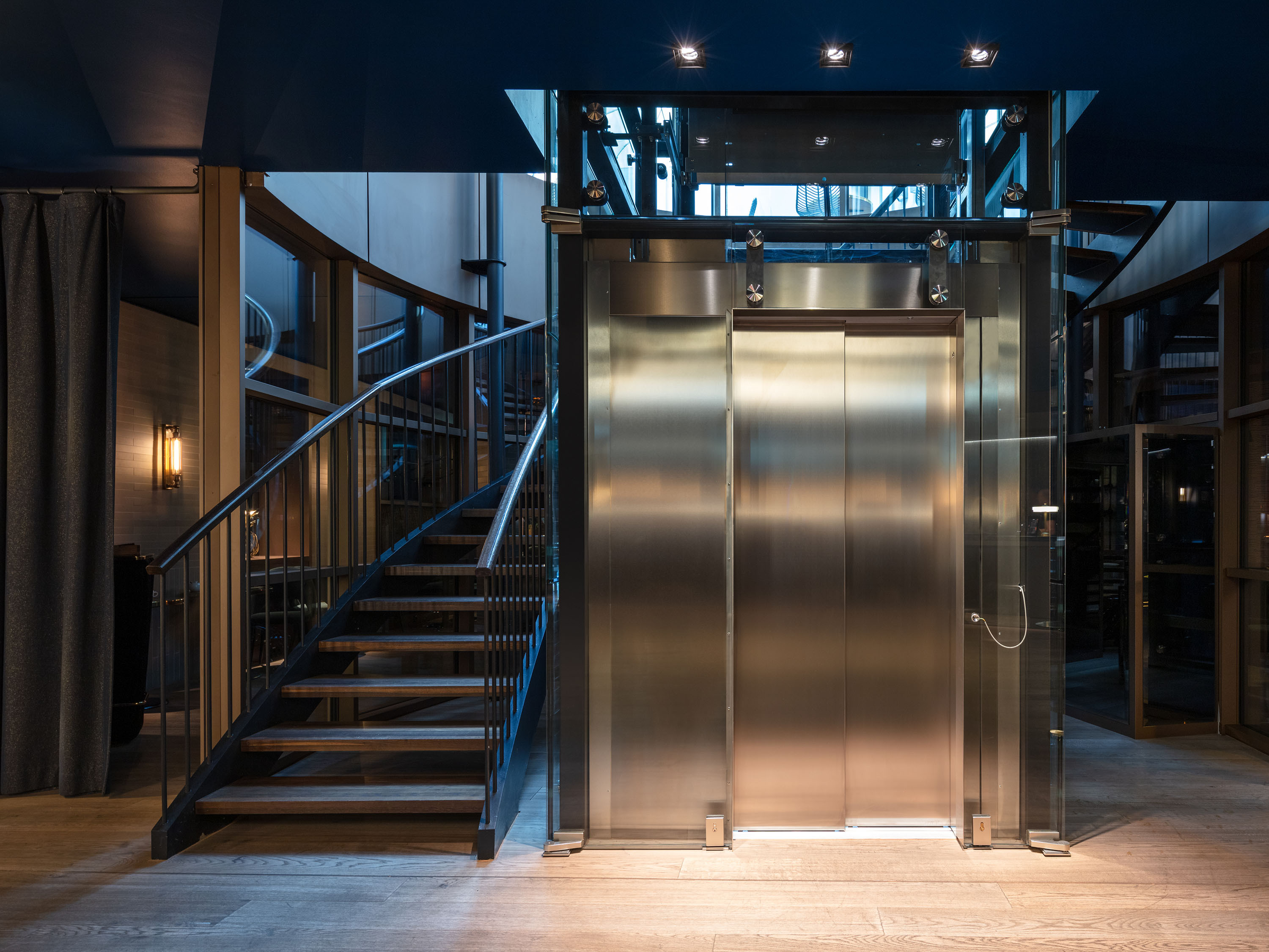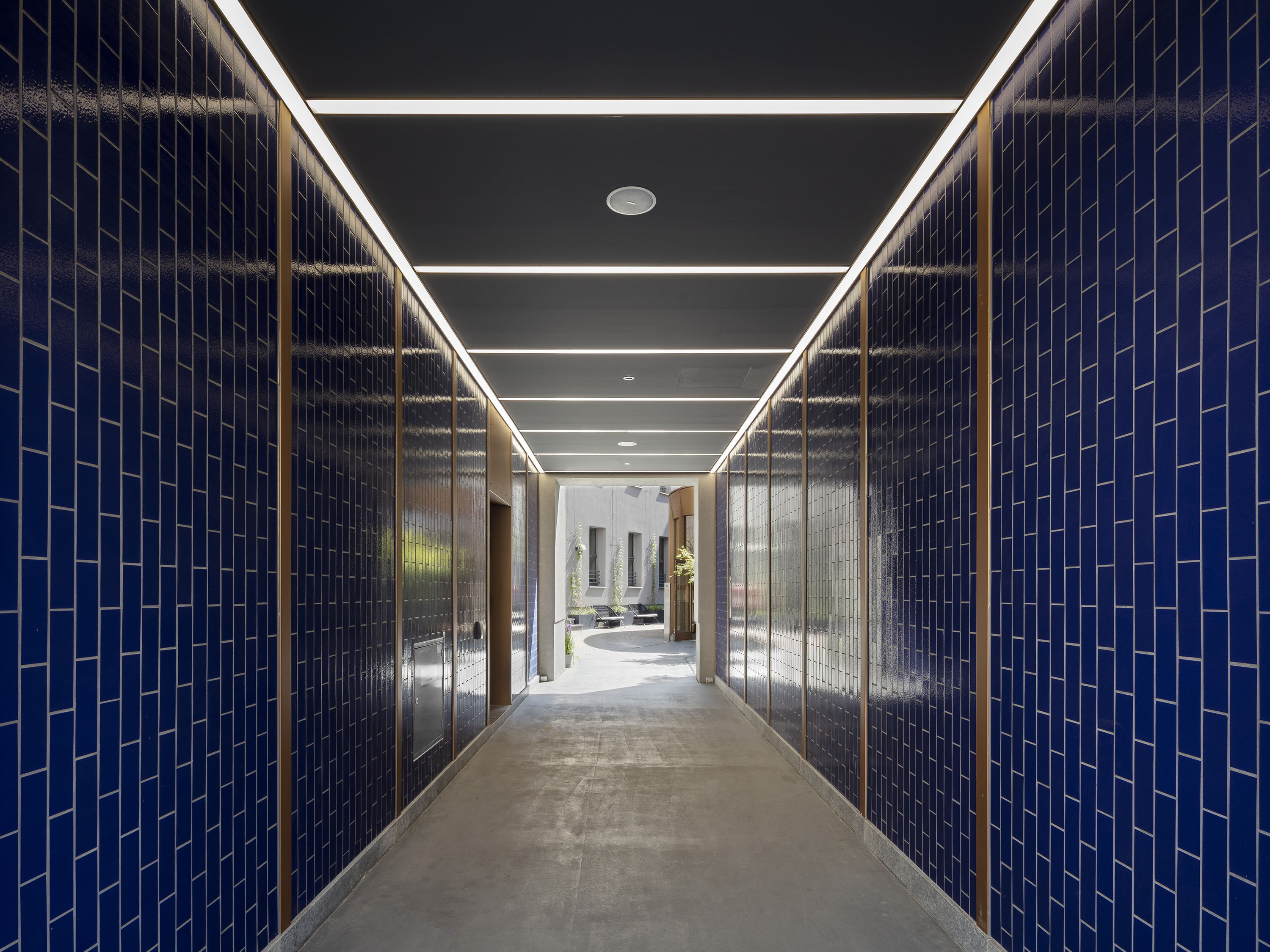 Access to the hotel lobby is from Friedrichstrasse via the courtyard entrance and the newly constructed, fully glazed bronze-coloured pavilion. The reception area, the breakfast area and the hotel bar are located in the basement.