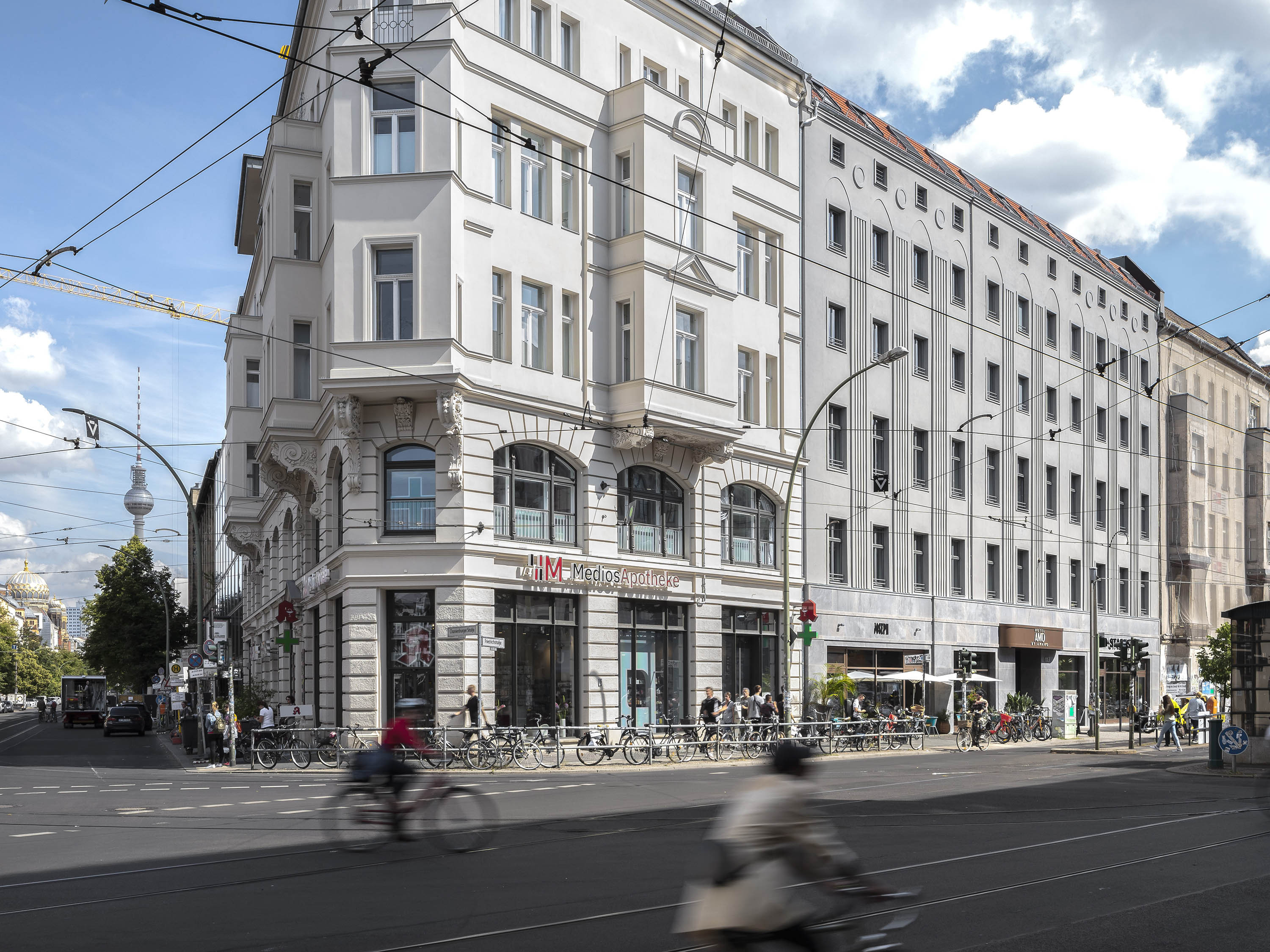 The five-storey volume with attic storey has a basement. The front building and side wings form a typical Berlin courtyard. In the upper floors and the ground floor 93 hotel rooms were built. Gastronomy and commercial units were planned in the ground floor of the front building.