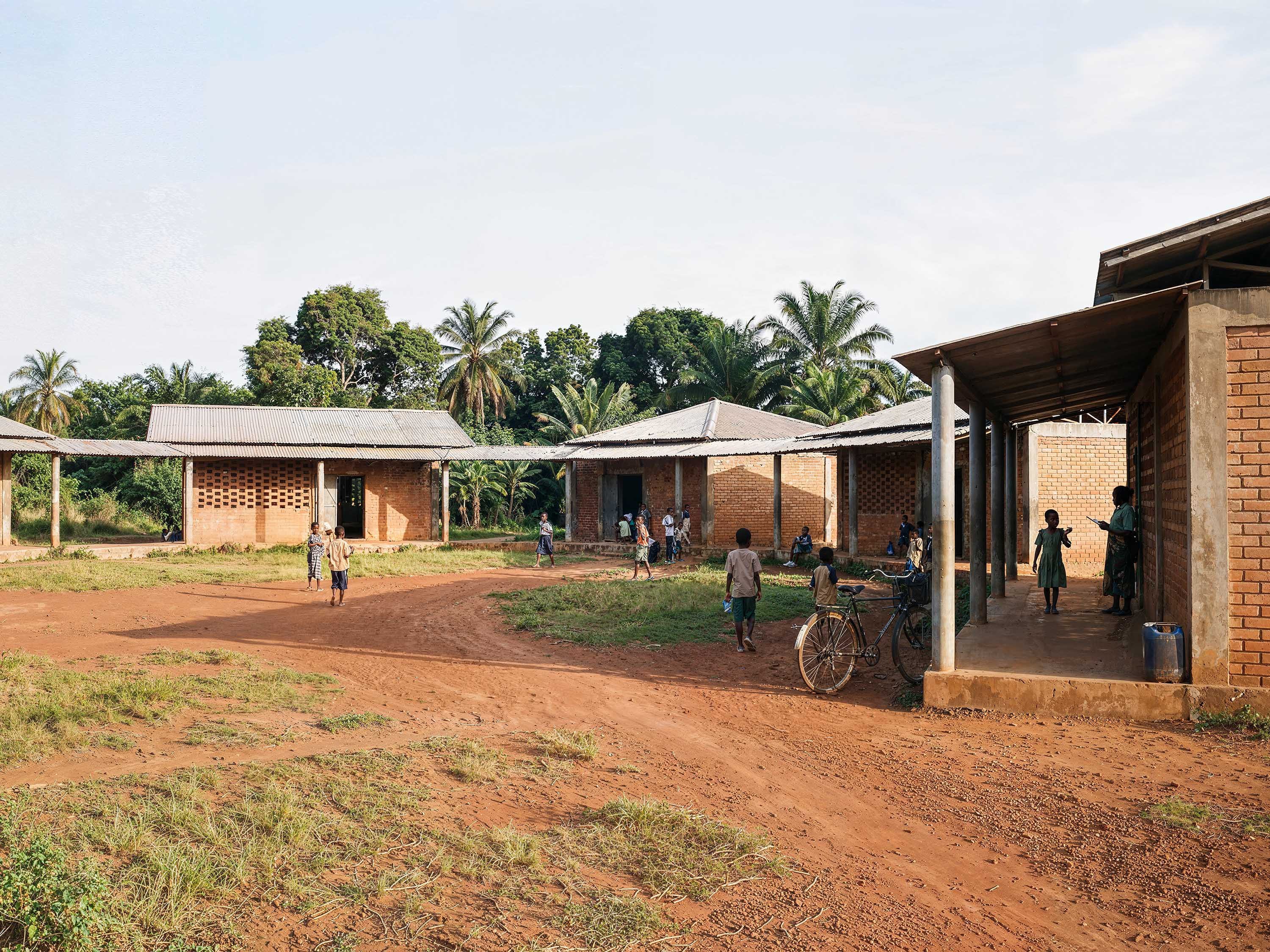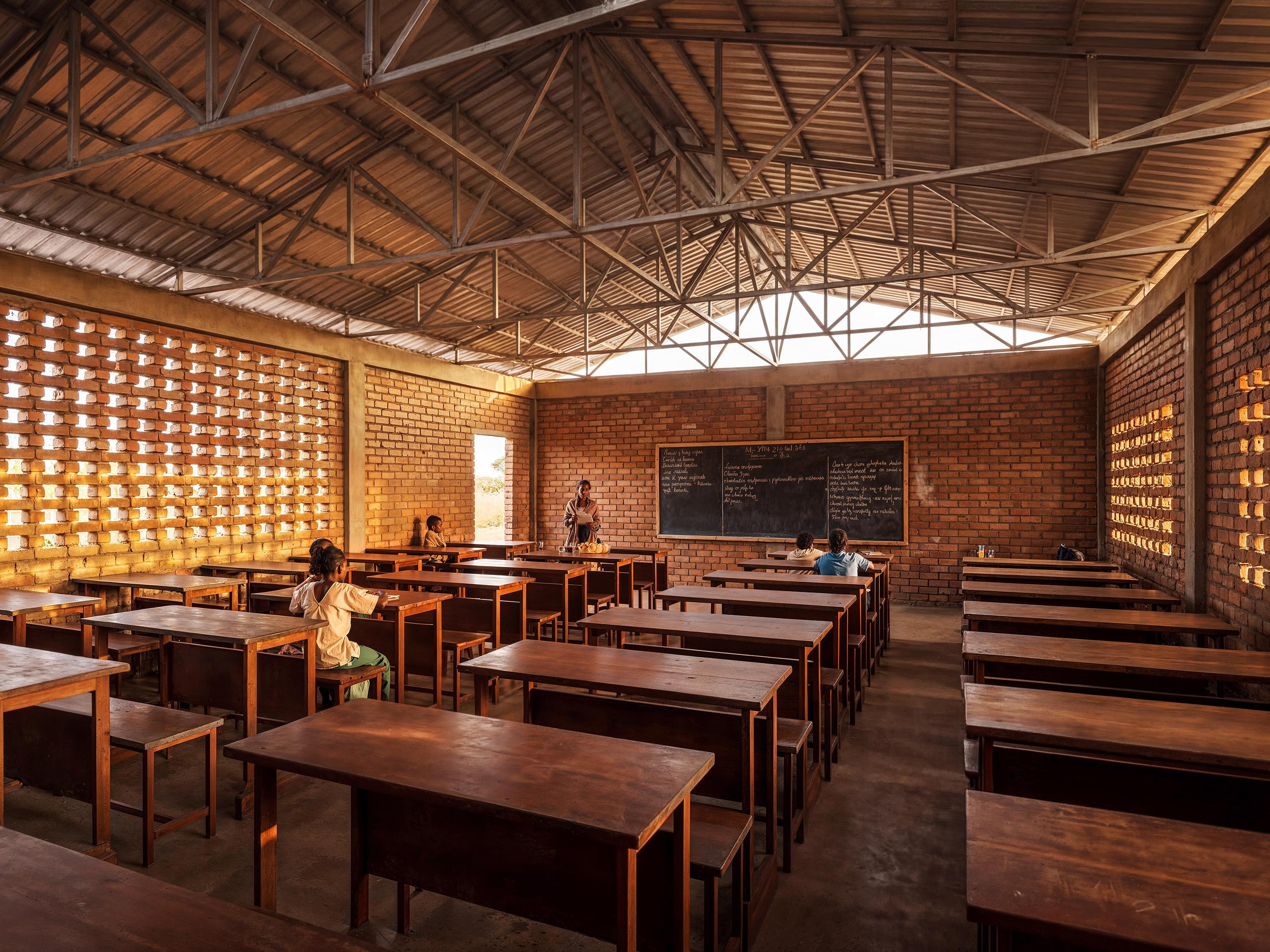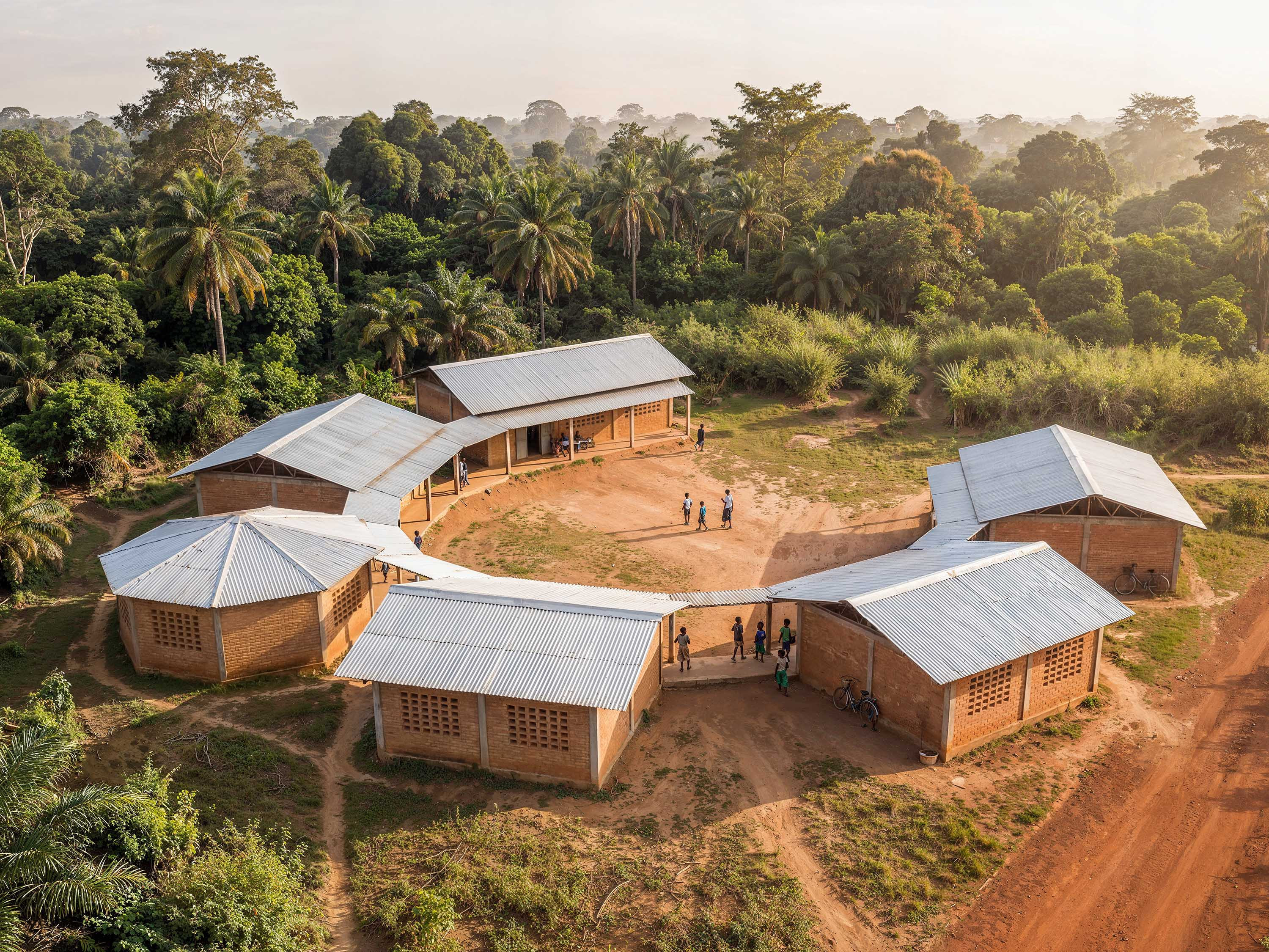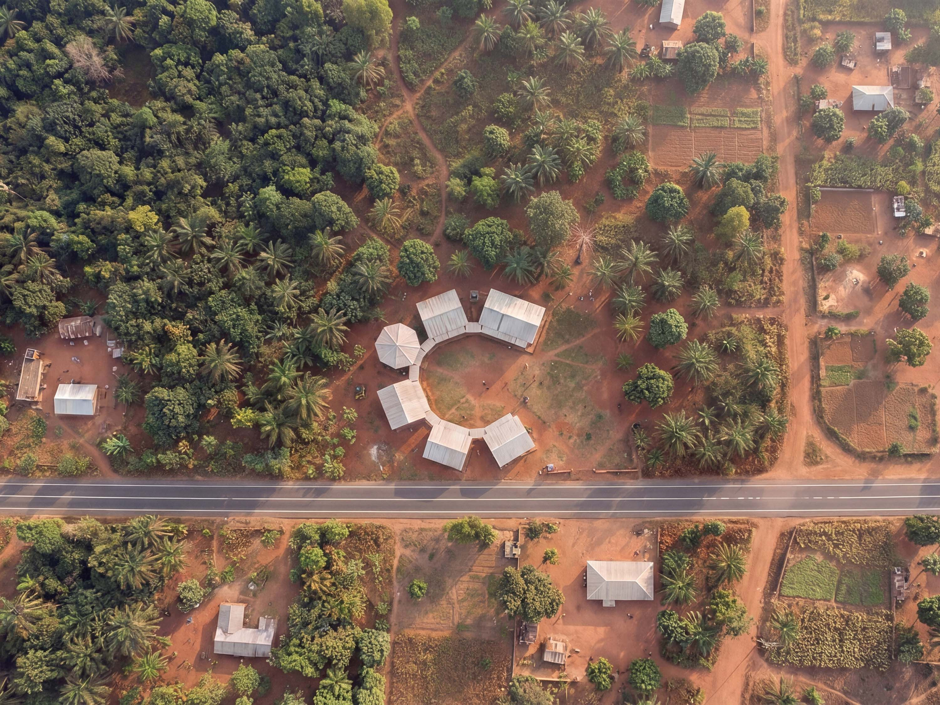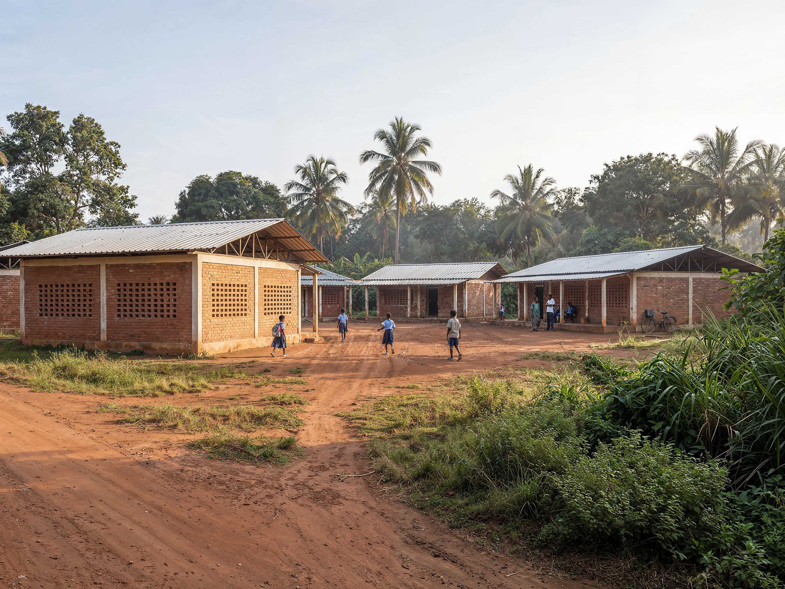 Each building is based on a reinforced concrete frame (8 × 8 m) with walls made of locally produced compressed earth bricks, using clay from the site mixed with cement and sand. This approach reduces environmental impact while actively involving the community in construction. The lightweight metal roof, clad with sheet metal, uses materials sourced from local markets. Passive climate strategies are central to the design: staggered brickwork creates natural ventilation, while the elevated roof enhances air circulation, ensuring thermal comfort in the hot West African climate. Referencing local traditions of circular dwellings, one classroom is designed as an octagon, linking contemporary architecture with vernacular forms and reinforcing cultural continuity.
