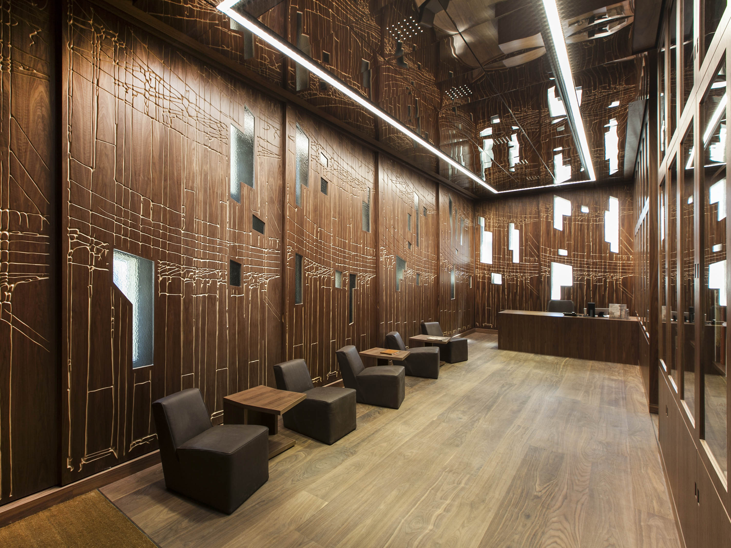 Two large openings in the street façade were designed as an entrance niche and a glazed loggia. The interior is divided into storeys: Reception and library on the ground floor, two exhibition areas above, the archive on the third floor and the and a meeting area with terraces on top.