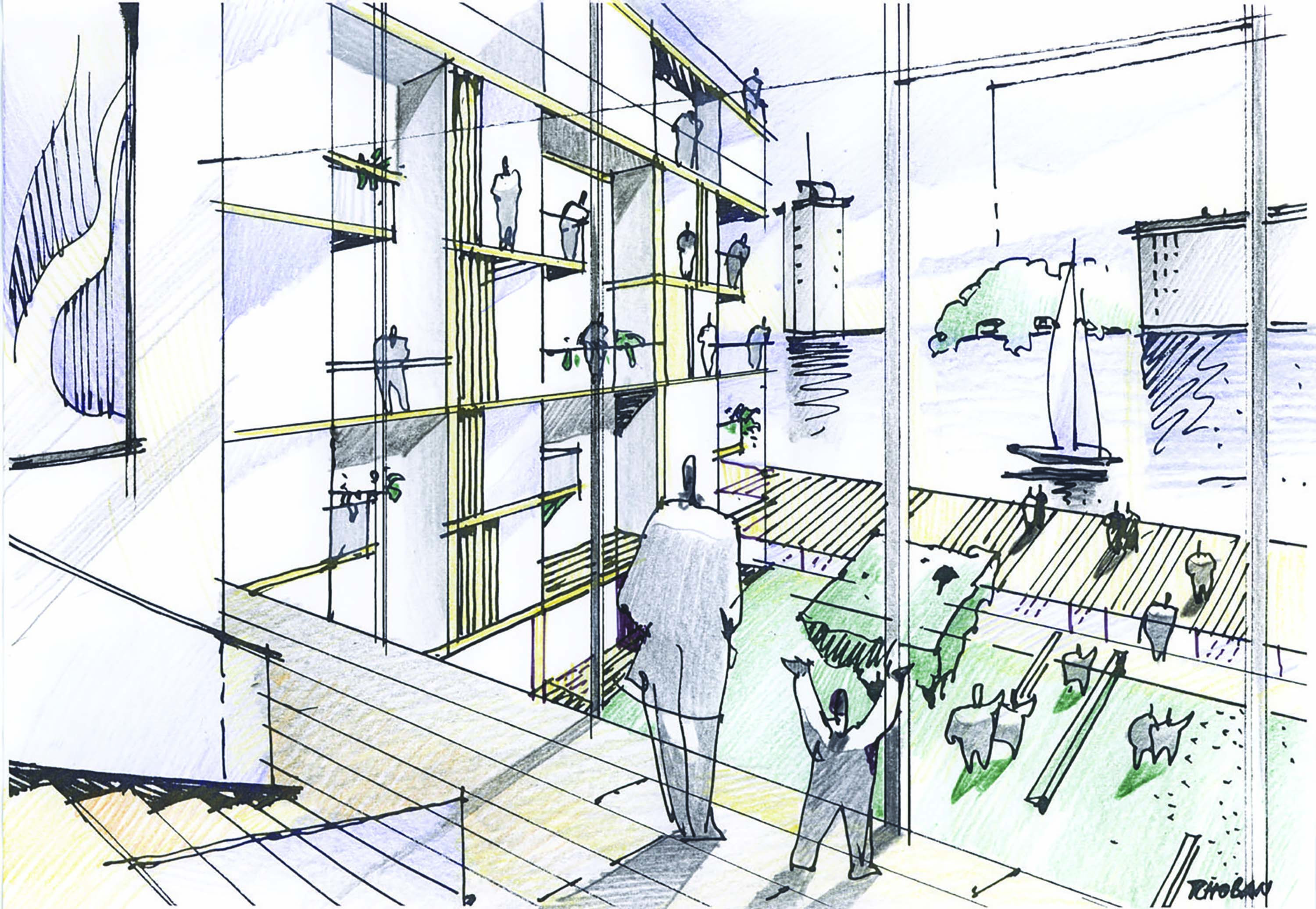 The building volume is divided into two blocks, each of which opens onto the water in a U-shape. Both cubatures are divided into seven storeys and connected to each other via a glass link. Above this, a further four storeys were built in the western block, of which the upper three storeys are realised as a structure cantilevering out to the river side by around twenty-one metres and are spectacularly reminiscent of a crane house.