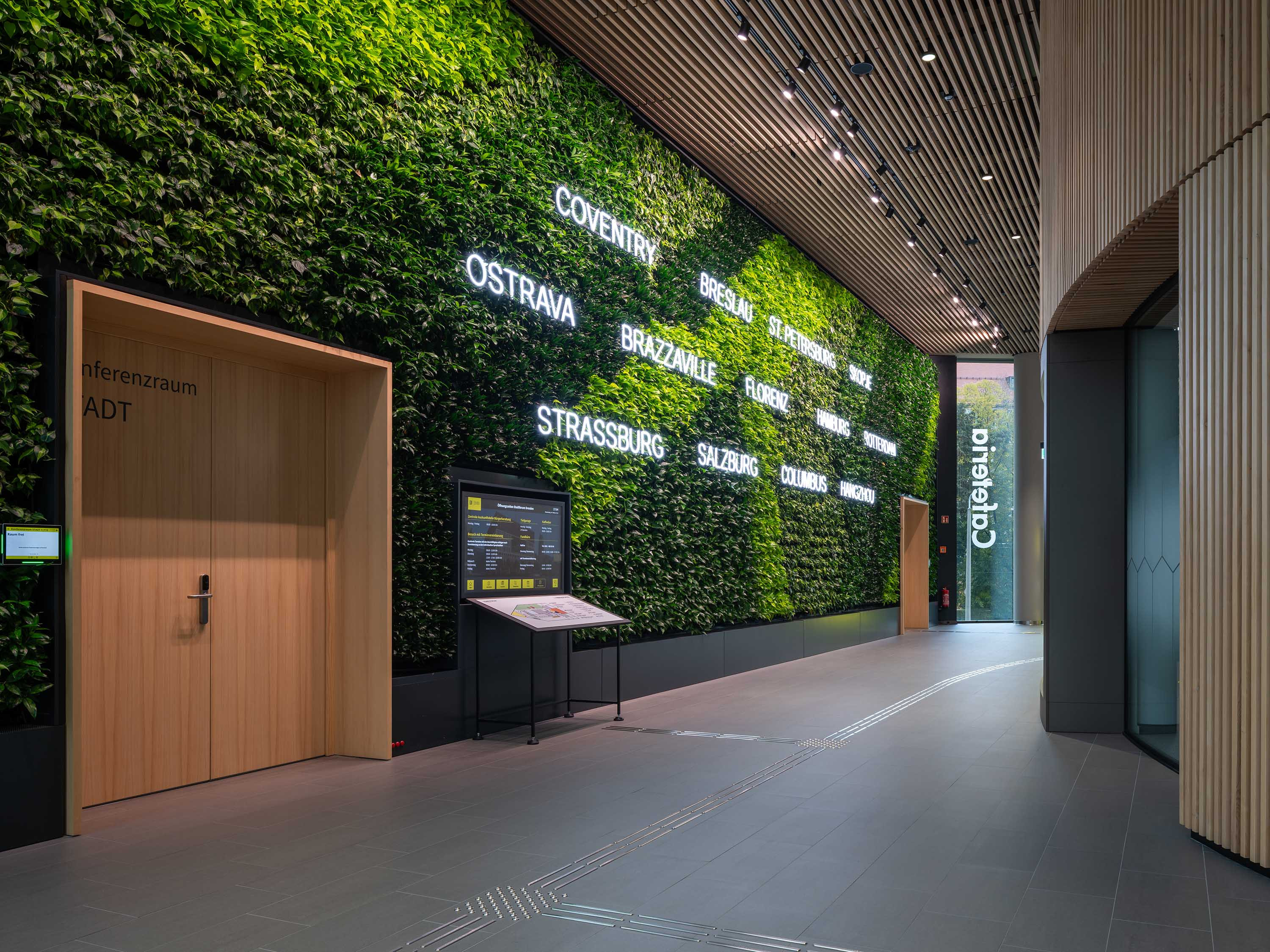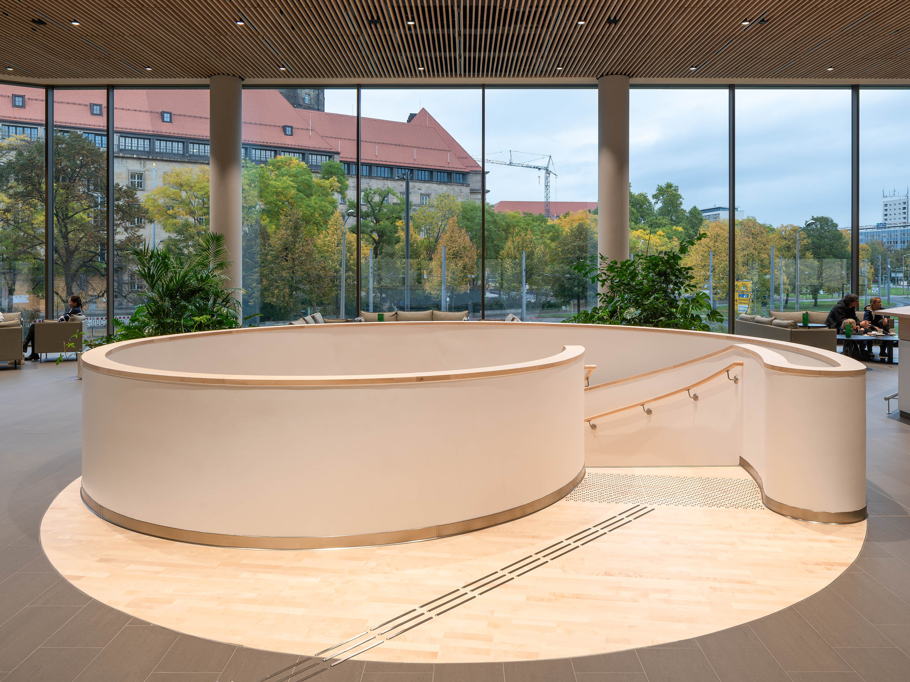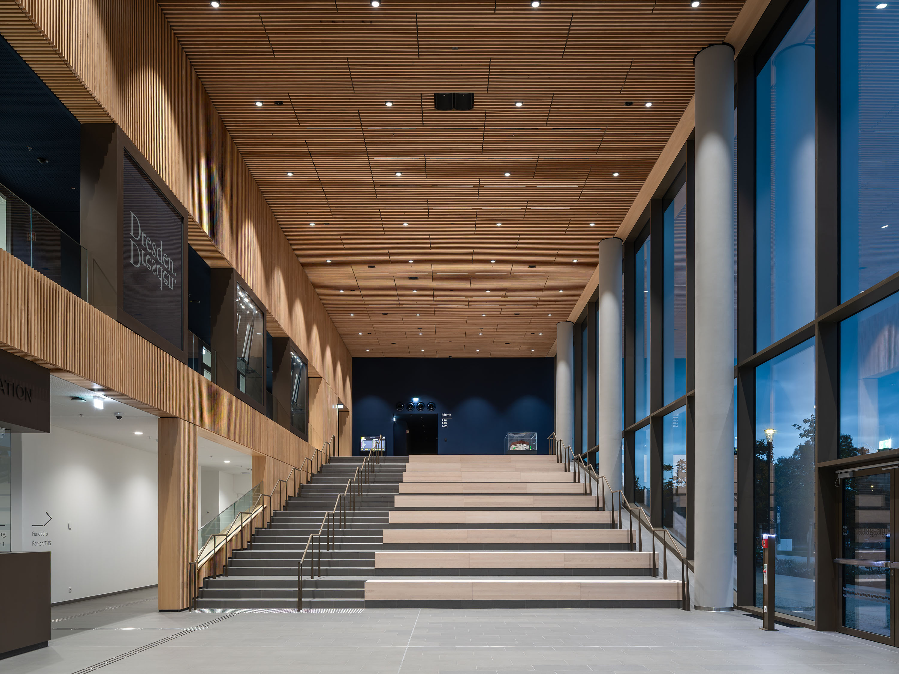 The ground floor contains publicly accessible areas including a foyer with an information desk, a restaurant, the city’s lost-and-found office, and rooms where citizens can receive advice. The foyer areas with their individual bronze-coloured elements and homogeneous grey flooring pick up on the materiality of the façade and outside amenities. This space takes its character from the silver-fur slats covering the walls.