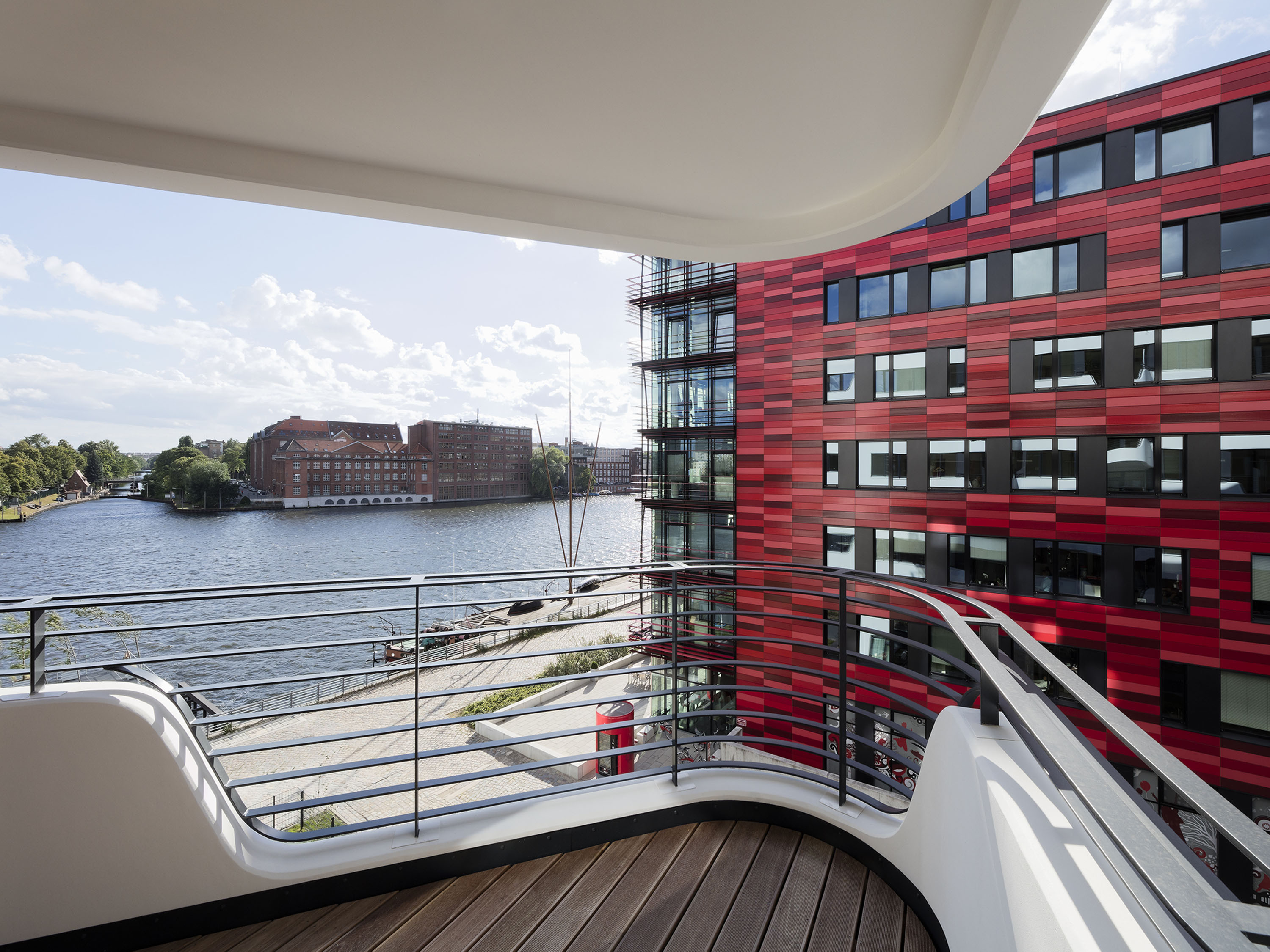 Down-to-earth and dynamic at the same time, the white building resembles a sea yacht at the harbour. The generous glazing offers wide panoramic views, the wrap-around balconies provide plenty of space in the fresh air, and the special location promises long walks along the Spree.