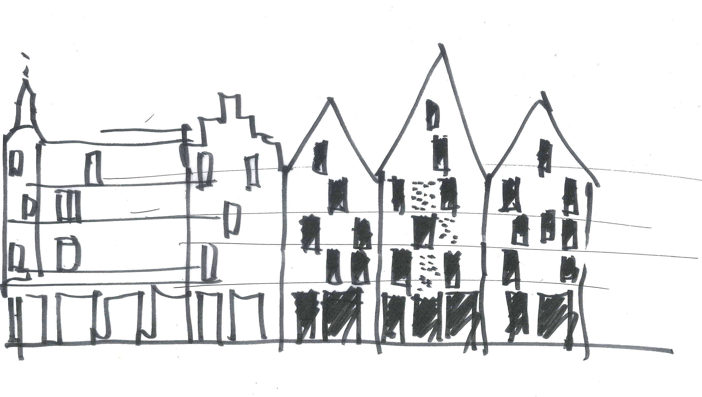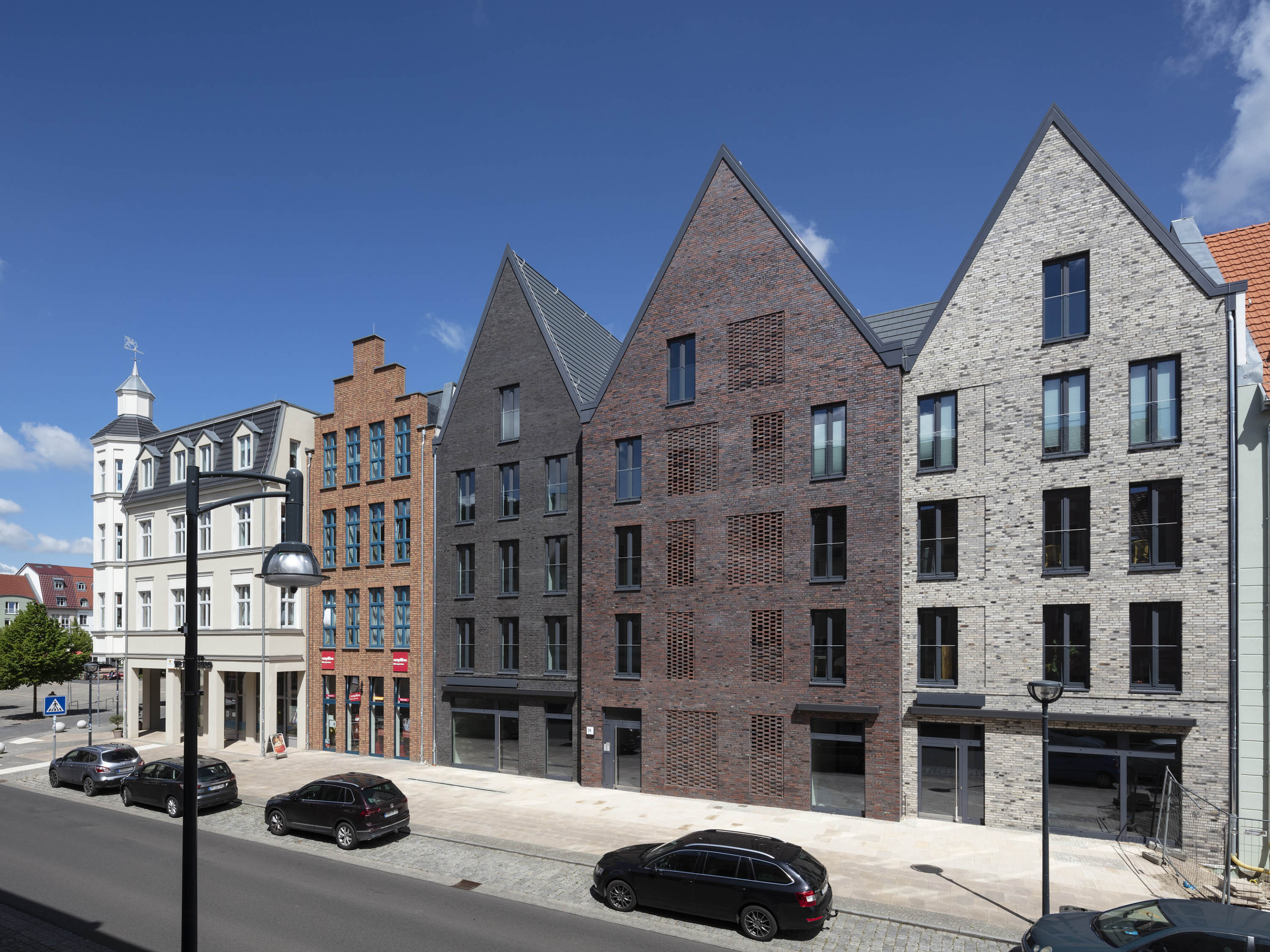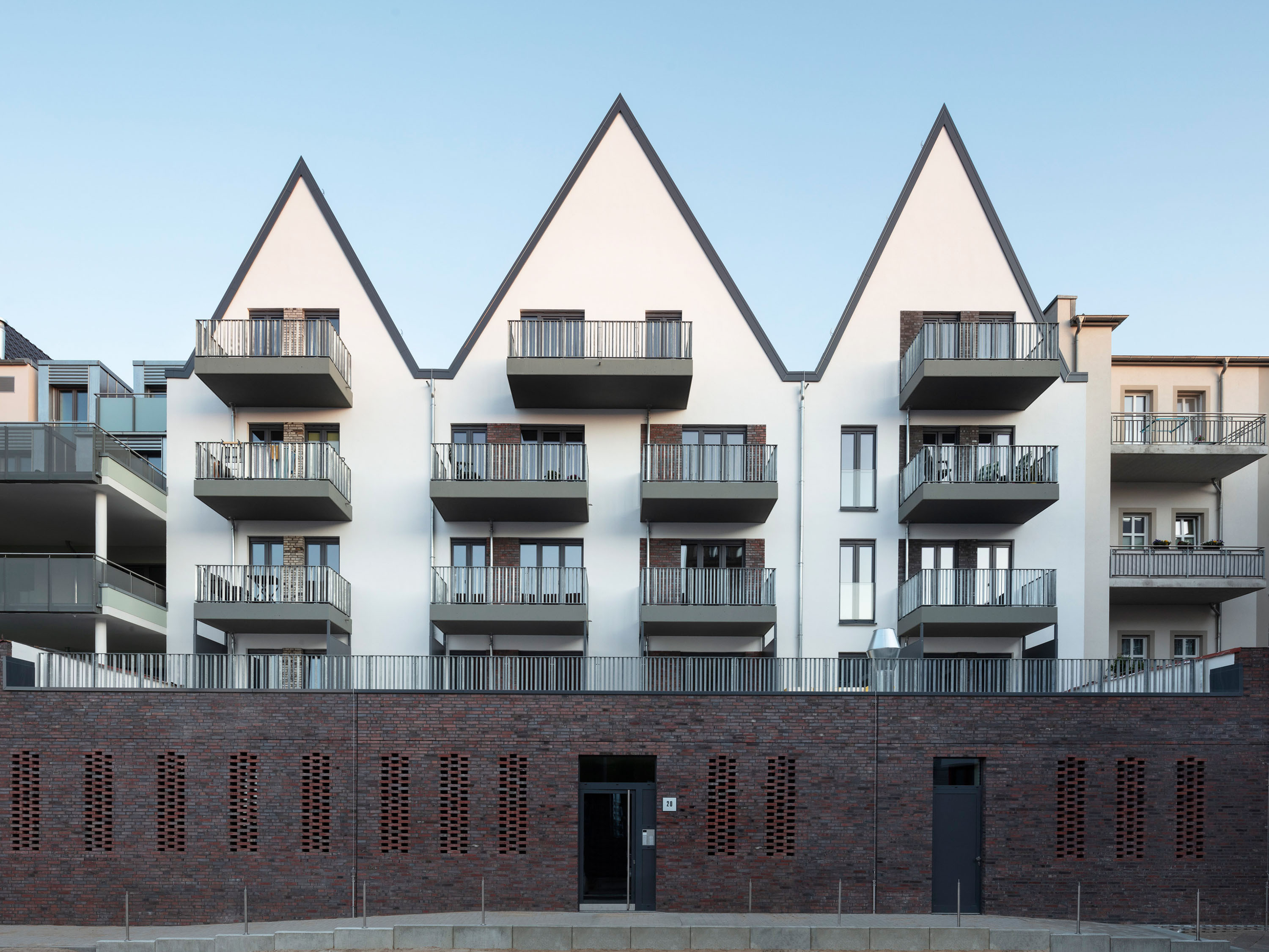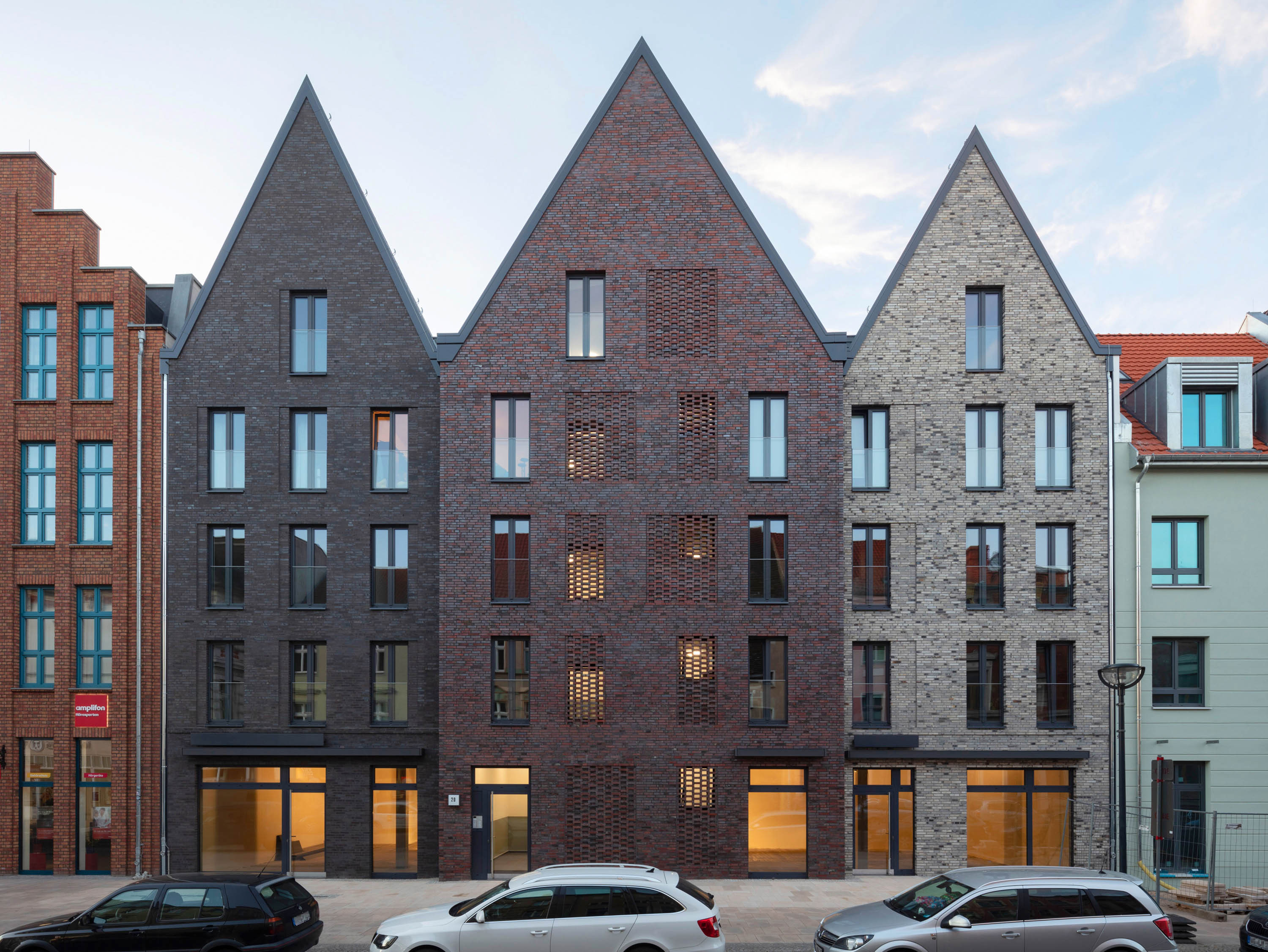 In reference to traditional plot sizes, the street façade is divided vertically into three parts. The rhythmic but uneven division of the front is emphasized by the slight protrusion of the middle facade gable and the differing ridge heights.